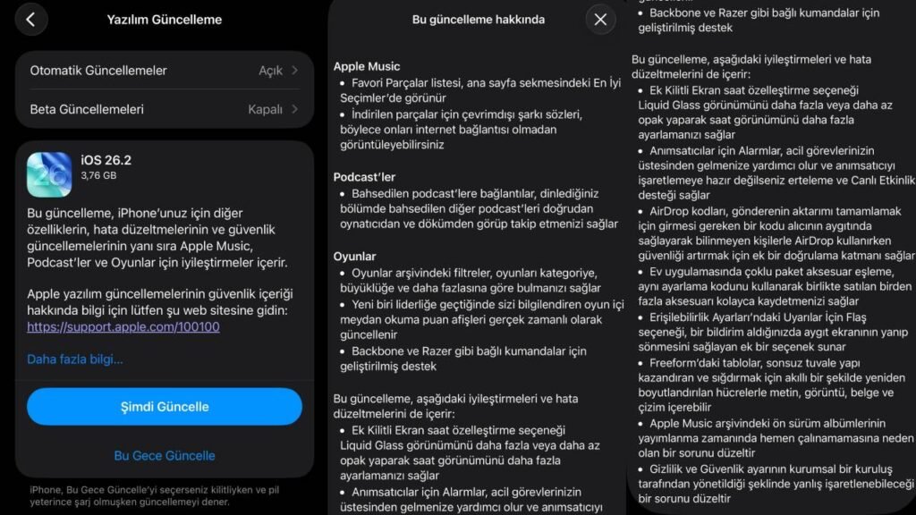 iOS 26.2, tüm bu yeniliklerin yanı sıra performans iyileştirmeleri ve güvenlik güncellemeleri de içeriyor. Güncelleme, Ayarlar > Genel > Yazılım Güncelleme bölümünden indirilebiliyor.